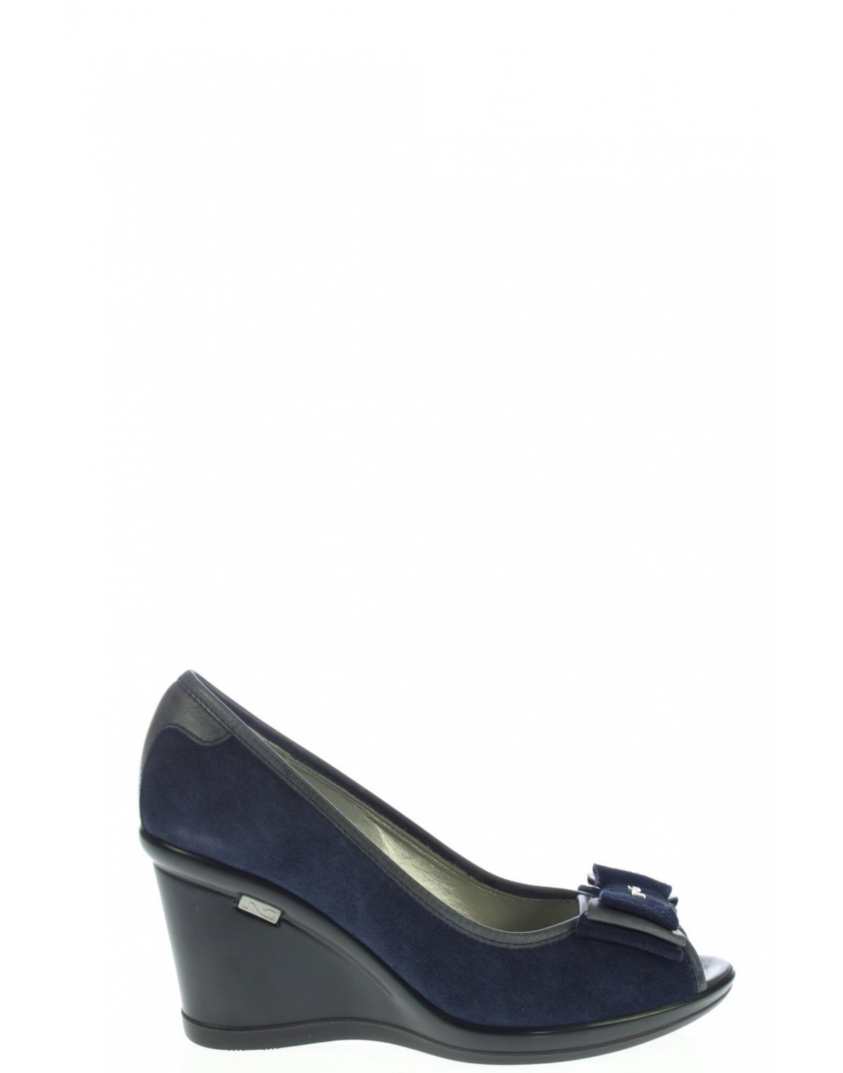 Aperto in punta in camoscio con rifinute in pelle con focco e accessorio, fondo gomma con zeppa altezza 8 cm . La calzata è normale per un maggior comfort si consiglia il solito numero. Tomaia 100% pelle. Made in Italy