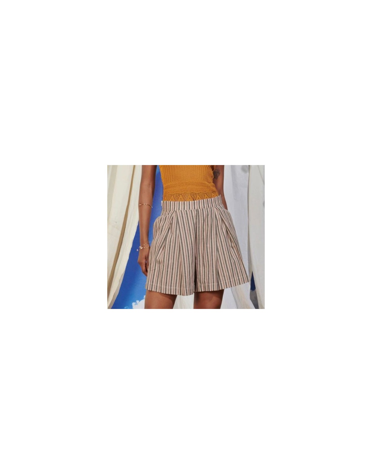 Pantaloncino corto in misto lino, modello svasato con pieghe baciate su davanti. Tasche nel fianco e zip laterale.